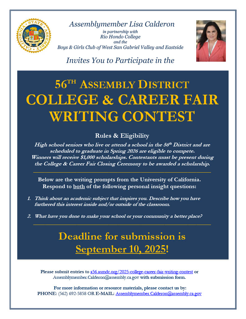 Assemblymember Lisa Calderon, in partnership with Rio Hondo College and the Boys & Girls Club of West San Gabriel Valley and Eastside, invites you to participate in the 56th Assembly District College & Career Fair Writing Contest.
